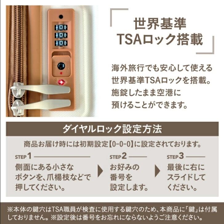 【TSAロック】ファスナータイプではなく、旅行箱は世界基準施設TSAロックを搭載するので、施錠したままで預けることができて、トラベルに安心できます。本体の鍵穴はTSA職員の検査用ですので、お客様には付属の鍵はございません。